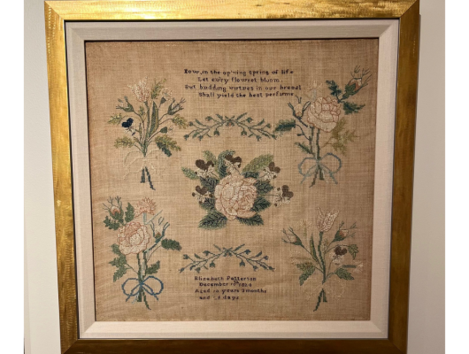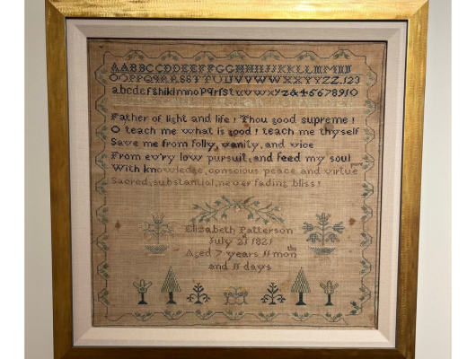 The Sampler Exhibit showcases a collection of hand-stitched needlework created by a young girl in 1821 (when she was 7 years old) and 1824 (when she was 10 years old). These embroidered pieces, known as samplers, were used to practice and display skills in sewing, lettering, and decorative design.